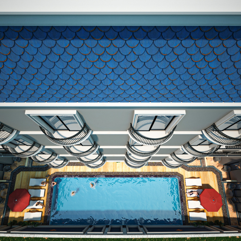 Struttura: edifici bassi immersi in piscine e giardini paesaggistici 🌿
